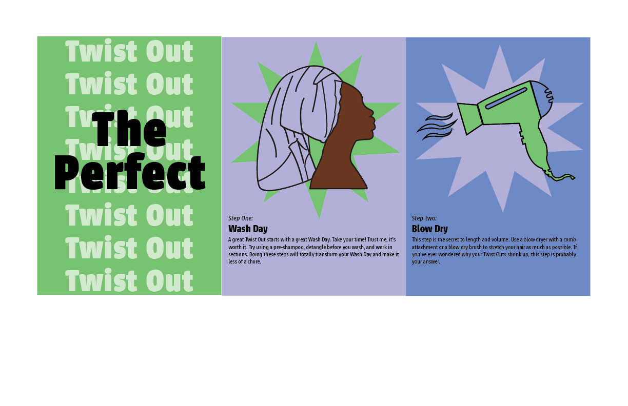 The Project: The Perfect Twist Out is a collection of logos that explain the process of styling your hair into a twist out. The logos use a simple artistic style to portray each step and are used in a foldable booklet.